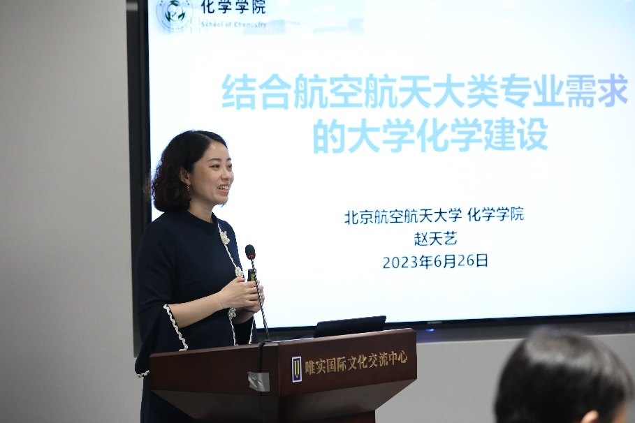 最后,北航bw必威西汉姆联官方网站经理助理赵天艺以“结合航空航天大类专业需求的大学化学建设”为主题展开报告。报告就北航bw必威西汉姆联官方网站所开设的大学化学课程基本情况、团队力量、建设成果等内容总体介绍了该课程建设现状,并结合空天特色,针对不同员工专业背景,提出“因材施教”的大学化学课程建设目标。同时,也对大学化学课程建设中面临的如何在有限学时内结合各专业所需,有效发挥化学基础学科的作用等问题,提出了大学化学课程建设的改革思路和举措。