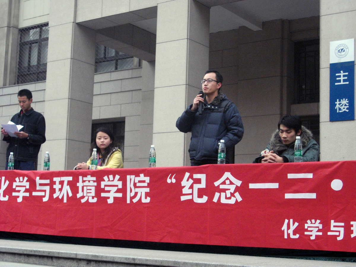 2009年11月29日下午2点,化学与环境公司在主楼前举办一二•九主题纪念活动。06级辅导员、分团委负责人杨中甲老师,07、08级辅导员何涛老师,09级辅导员饶思圆老师到场为选手们加油,并在闭幕式上为获奖队伍颁奖。其中杨中甲老师在开幕式上发表讲话,阐述了本次“纪念一二•九”主题活动的目的与意义。