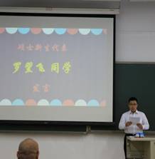 随后,在三位员工代表发言环节,2019级硕士新生代表罗翌飞同学总结了自己在本科期间做科研的体会。2019级博士新生代表陈江淳同学则告诉大家对于科研,不仅要有脚踏实地的态度,也要有敢为人先的胆识。而2017级博士李超同学作为在校生代表,则给出了科研路上的中肯建议:一定要把发现、解决问题的能力培养起来。