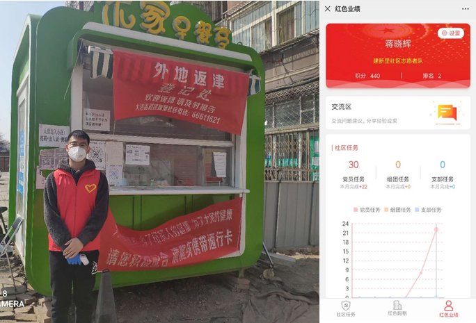 蒋晓辉是公司2018级的研究生,也是一名入党积极分子,当他听说社区需要志愿者的时候,就主动报名加入到了“天津市建新里志愿服务团队”中。他说:“国家遭受疫情冲击,每天都有大量的医生和护士团队驰援武汉,大量的党员战士们冲锋在战斗一线,他们是最美的逆行者,让我深深敬佩,作为青年人,我也想为抗击疫情出一份力,可我既不是医生,也买不到口罩可以捐赠,所以看到社区招募志愿者的消息,我就马上报名了,希望能为抗击疫情贡献自己的绵薄之力!”